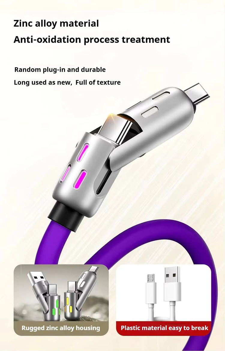 Multi-Device Compatibility: Four-in-one design with Lightning, Micro USB, and Type-C connectors, suitable for Apple and Android devices.